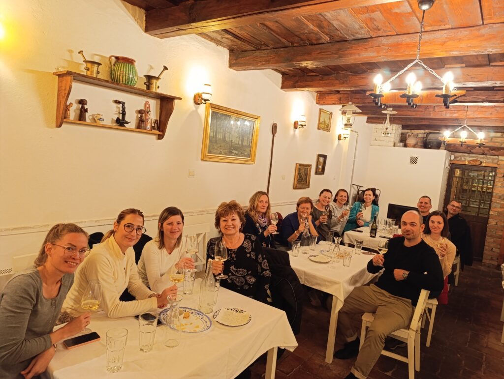 A borkóstoló: nem szerettem volna kihagyni a programból, ugyanakkor idén csak opcionális volt. Nagy örömömre többen jelentkeztek, összesen férjemmel és velem 13-an vettünk részt a helyi Csárdában egy 4 tételes borkóstolón. A Dubicz borászat tulajdonosa Dunai Ágnes jött fel hozzánk, és egy nagyon-nagyon informatív programot tartott számunkra. A borsort én raktam össze előzetesen, fehérborokat választottam, Irsai Olivért, (mert ez a kedvencem, meg sokak által ismert és kedvelt, könnyed bor) Virgoncz nevű házasítást, majd egy Chardonnay-t , végül egy prémium kategóriás, fahordóban érlelt finom bort, a Sárhegy Olaszrizlinget kóstoltunk meg. A hatalmas tudással rendelkező hölgytől az összes feltett kérdésünkre is választ kaptunk, több mint 2 órás volt végül a borkóstoló. Rengeteg információval gazdagodtunk nemcsak a borokkal, hanem a borászat minden területével kapcsolatban. Imádtam, hogy nem beszéltünk arról, hogy bodzás-zöldalmás-legelő és egyéb illatúak a borok, egyszerűen csak élveztük azt, szépen, ahogy kell, először csak a szemünkkel, aztán az orrunkkal, s csak utána a szánkban…